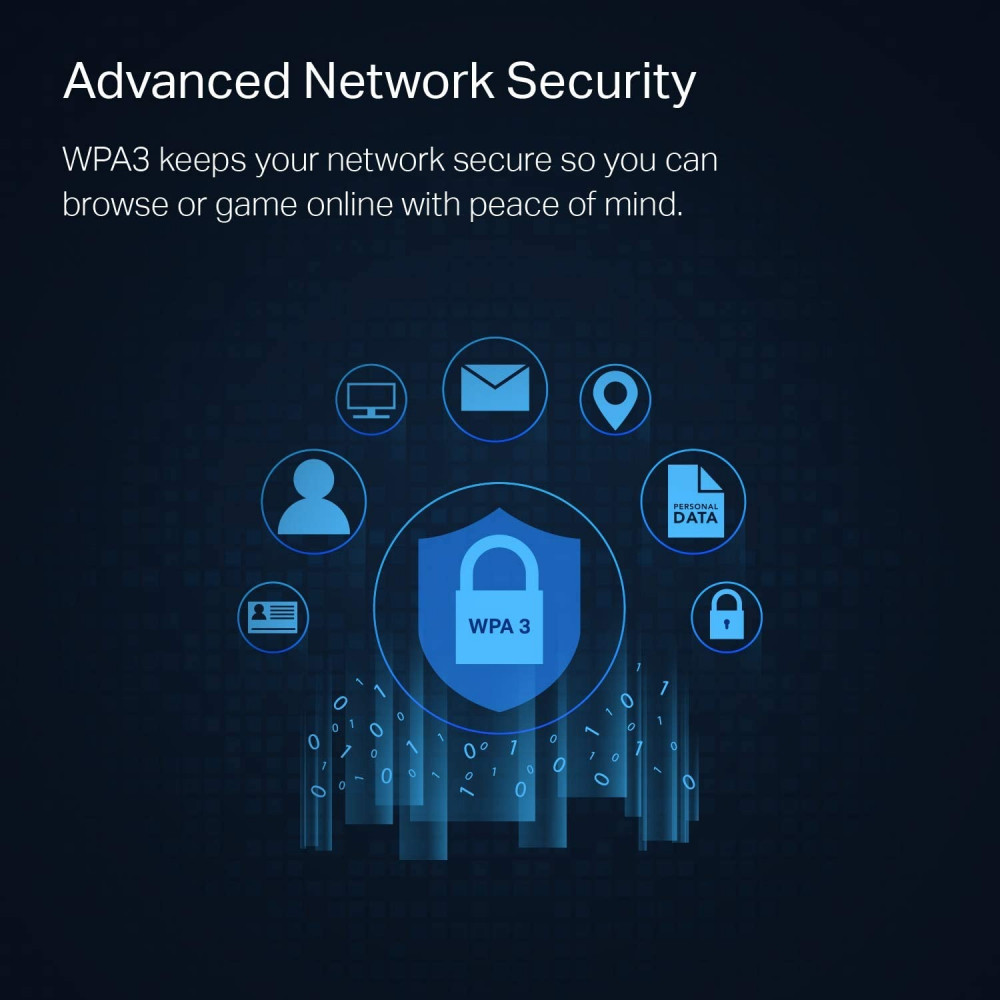 WPA3 ، أحدث معيار أمان للشبكة يوفر تشفيرًا فرديًا وأكثر أمانًا لكلمة المرور ، ويحمي شبكتك من القرصنة اللاسلكية ويضمن أن اتصالك اللاسلكي آمن تمامًا أثناء تصفح الويب والتسوق عبر الإنترنت.