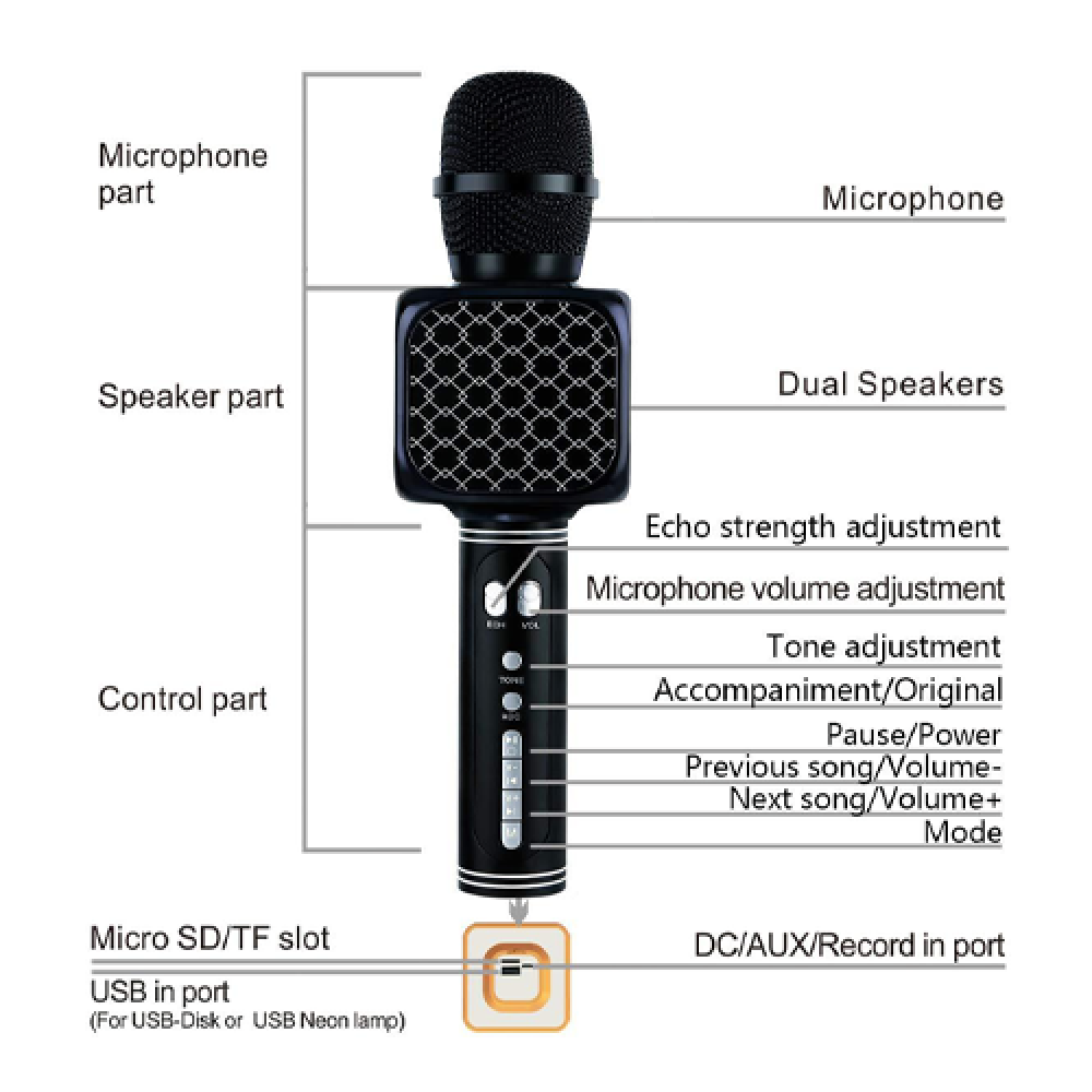 • يقوم بتشغيل الموسيقى من هاتفك الذكي ويسمح لك بالغناء تحتها وتسجيل أغانيك (فتحة بطاقة ذاكرة مدمجة لتسجيل الموسيقى بتنسيق MP3).